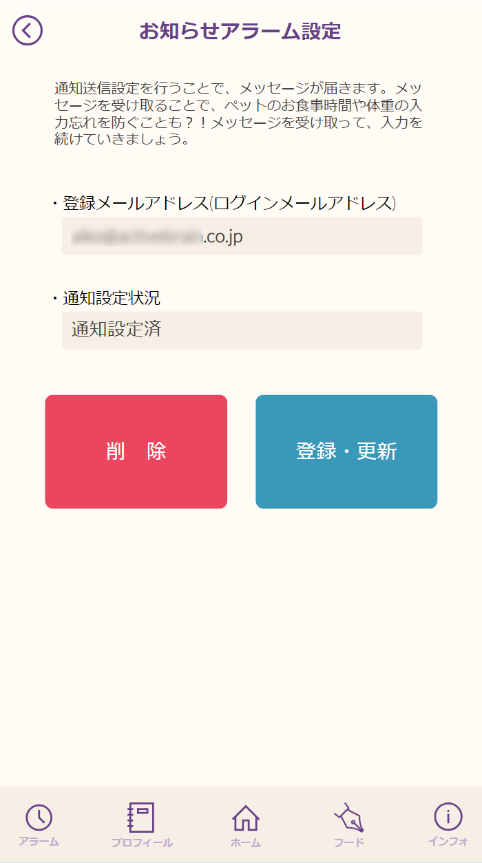 アプリを使う際の初期値としては、メッセージの受信は不要となっております。メッセージを受け取るためには通知設定の状況を「通知設定済」になるよう「登録・更新」ボタンを選択してください。通知設定状況が「通知設定済」に変更されましたら、メッセージが届くようになります。反対にメッセージが不要になりましたら、「削除」ボタンを選択してください。