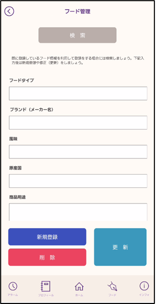 フード画面で入力できる項目は、フードタイプ、ブランド(メーカー名)、風味、原産国、商品用途、その他保存しておきたいコトをメモ欄に入力することができます。入力した内容は修正することも可能で、不要であれば削除することもできます。登録したい内容が既に登録したフード情報と似ている場合には、「検索」ボタンから既存データを表示し、利用できるデータを選択・修正することで新しいフード情報として登録することもできます。