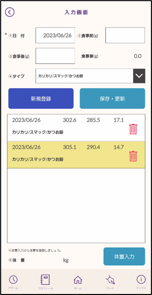 アプリでは日付ごとで管理をすることができます。その日に食べたもの、それを何グラム食べたかを入力しましたら、一覧で確認することができます。※フードの種類などはフード画面から事前に登録しておく必要があります。